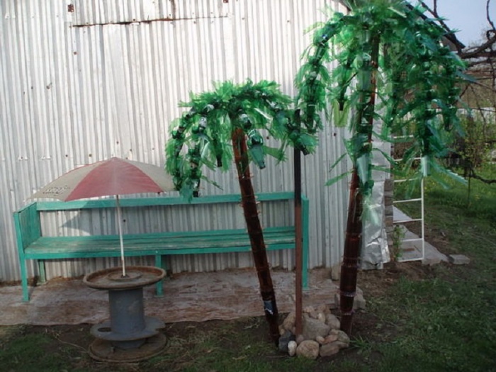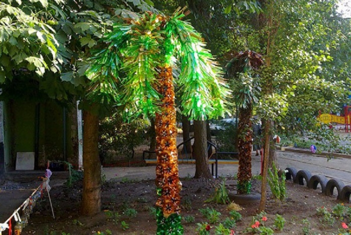 На фото, особо искусно сделанные пальмы из пластиковых бутылок, удивительно похожи на настоящие. Двор, в котором «растет» подобная красота будет выглядеть как экзотичные тропики, даже в снежную зиму.