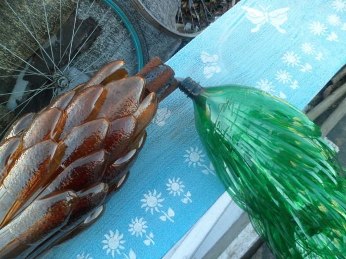 Иногда, чтобы не искать такого огромного количества однотипных бутылок коричневого цвета, собирают одинаковые по форме белые, и после прикручивания их донышек саморезами к деревянному основанию ствола, окрашивают вместе с ним в один коричневый цвет.