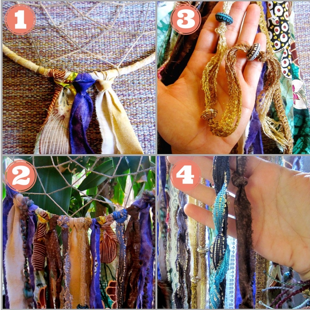 Можно использовать все натуральные материалы: обруч только деревянный, нитки — шерсть, хлопок, лен, конский волос, натуральная кожа и замша, бусины из дерева, камня или стеклянные. Самое главное — избегать синтетики.