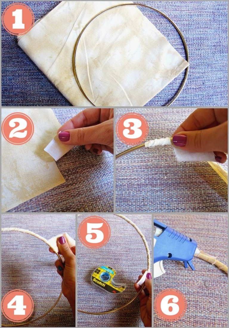 1. Зафиксируйте шнур, завязав его вокруг обруча, оставьте конец длиной 15 сантиметров. Возьмите другой конец шнура и обмотайте его вокруг обруча. Чтобы было удобнее работать, сверните длинный конец в небольшой моточек. Следите, чтобы шнур хорошо туго натягивался и ложился плотно.