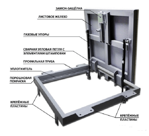 Уголок, труба, лист и другие металлические составляющие люка существенно утяжеляют общую конструкцию.