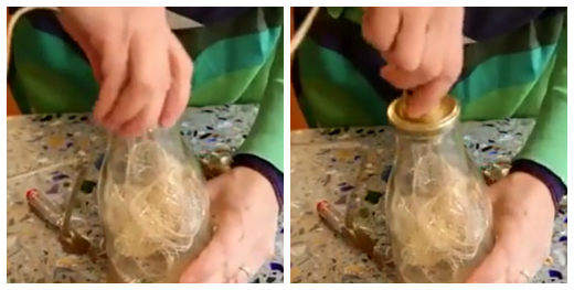 Вставляем чопик в горлышко, придавливая им провод для закрепления нашей лампы.