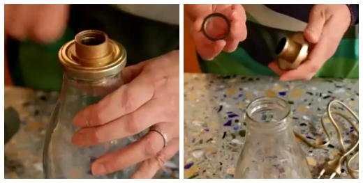 13.Прокладка в отверстие бутылки. Можно воспользоваться специальной прокладкой, чтобы закрепить провода. Это необязательно, но так вы сможете предотвратить случайное повреждение проводки. К тому же, с такой прокладкой внешний вид светильника будет смотреться намного лучше.