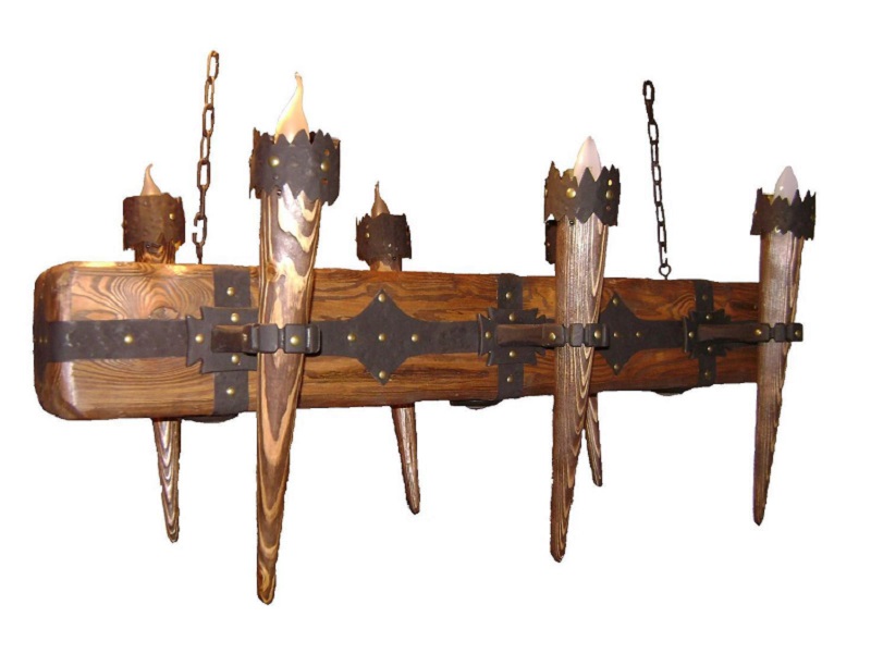 Люстра из дерева под старину ассоциируется со средневековой романтикой и рыцарскими турнирами. Вкрапления кованных металлических элементов придают такой конструкции изысканную легкость и неповторимый колорит.