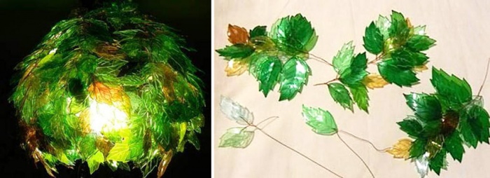 - Из пластиковых бутылок, вырезаем заготовки, в виде листиков разной формы и размеров.