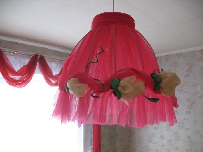 И так, измерьте абажур и сделайте выкройку. Выбирая ткань, обратите внимание на её плотность. Это может быть органза, шифон или более плотная ткань мешковина, лён. Сшейте детали и, натянув полученный чехол на каркас, закрепите ткань при помощи ниток. Теперь украшайте абажур кружевами, бусинами и искусственными цветами. К готовому абажуру присоедините патрон и подключите провод, осталось вкрутить лампочку и люстра своими руками (как на фото) готова.