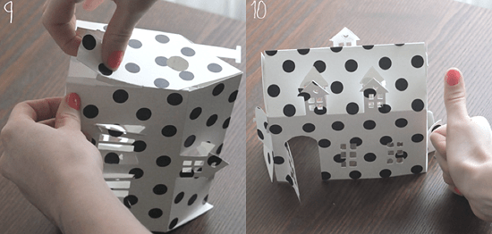 Мастер-класс по обустройству строения из бумаги предусматривает расположение дверных и оконных проёмов, посредством прорезей и устранения из них необходимого количества бумаги. С одной части дверного проёма не следует делать прорез, и временно её следует не прикрывать.