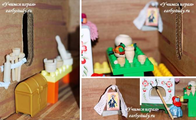 На окошки из салфеток сделала занавески. В красный уголок поместила иконку. В «женский уголок» за печкой из коричневого картона смастерила сундук