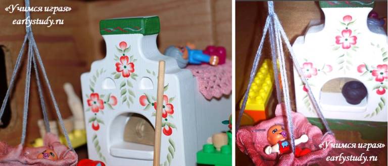Крючком связала коврик. Из пластилина слепила кухонную утварь. Из скорлупки грецкого ореха сделала колыбельку.