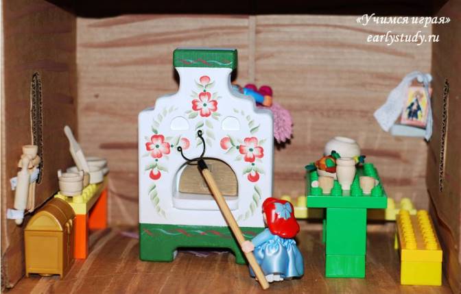 На окошки из салфеток сделала занавески. В красный уголок поместила иконку. В «женский уголок» за печкой из коричневого картона смастерила сундук