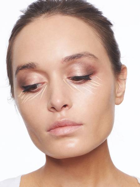 Погрешности в нанесении теней скорректируйте с помощью консилера. Мы использовали High Precision Retouch от Giorgio Armani – он не сушит кожу и не забивается в мимические морщины. Консилер поможет убрать осыпавшиеся частички хайлайтера и замаскировать синяки под глазами, поэтому не забудьте нанести его во внутренний уголок глаза – там, где проходит вена, которая и «задает тон» всему синяку.