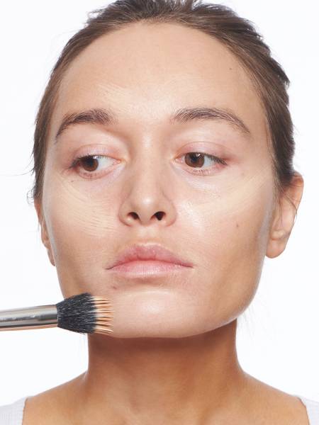 - В качестве тональной основы используйте Luminous Silk от Giorgio Armani (мы использовали оттенки 4 и 5,75) – он отлично подойдет для сухой кожи. Наносите крем кистью среднего размера, начиная с Т-зоны и растушевывая его на остальные участки лица.
