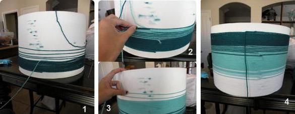 После того, как каркас готов, его нужно обшить тканью. Можно не обшить, а просто обмотать. Это отдельная процедура, которая, впрочем, тоже особой сложности не представляет. Если вы собрались обматывать абажур только тканью, для начала его предстоит обмотать хлопчатобумажной тесьмой. Только подвес и арматуру не нужно обматывать. Расчёт тесьмы таков: длина каждой стойки + длина каждого кольца, всё умножаем на 3. Далее производим обмотку.