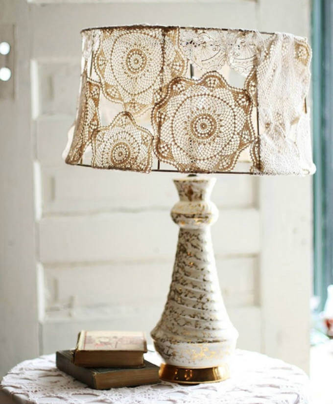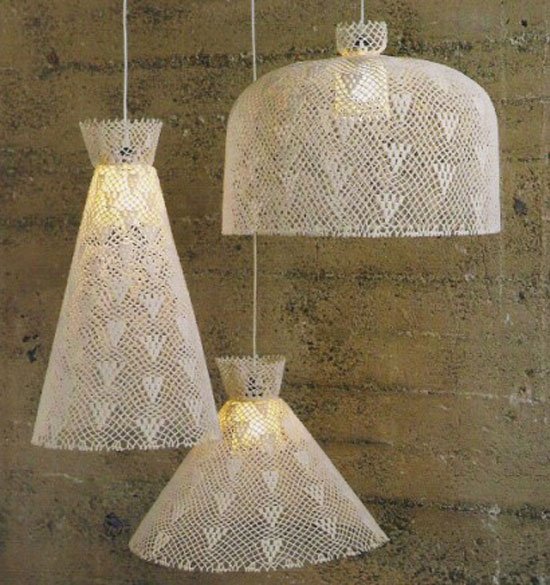 Вязаные салфетки и обычный клей ПВА способны оказать помощь в создании настоящего произведения искусства. Для работы Вам понадобится сферический шаблон, клей ПВА и вязаные кружевные салфетки. В качестве шаблона можно использовать обычный таз понравившейся формы. Шаблон необходимо намазать клеем и наложить на него кружевные салфетки. Густо покрыв клеем всё изделие, оставьте его высохнуть на некоторое время, после чего аккуратно снимите с шаблона. Для закрепления результата рекомендуется покрыть готовое изделие лаком для декупажа. Не забудьте вырезать отверстие для плафона перед наложением салфеток на шаблон.