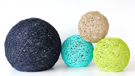 Круглый плафон из ниток создаётся аналогичным методом, но в качестве шаблона используется воздушный шарик, а вместо готовых вязаных салфеток в работу вступает обычная пряжа. Обмазав надутый шарик клеем ПВА, обмотайте его нитками. Остатки клея густо нанесите на кокон и дайте хорошо просохнуть. По окончании сушки проткните шарик иголкой и аккуратно вытащите через оставленное вокруг пуцки шара отверстие. Лак для декупажа закрепит конечный результат, а краска из баллончика создаст неповторимый и уникальный дизайн Вашего плафона.