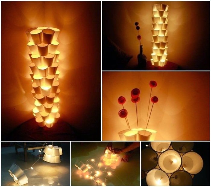 Бумажные стаканчики, склеенные вместе, позволят создать объёмный и креативный плафон. Красивые одноразовые стаканчики из бумаги приклеиваются друг к другу при помощи термоклея, образуя полусферу. При помощи разноцветных стаканов можно создать уникальную расцветку будущего плафона.