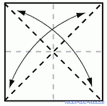 | Гармошку сложите пополам, это делается, чтобы обозначить линию середины. Разверните этот сгиб. Отрежьте кусок бумаги по диагонали от внешнего нижнего угла к середине, но не доходя до нее. | |
