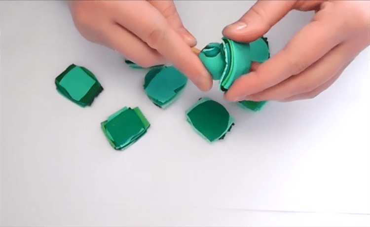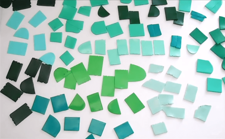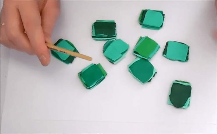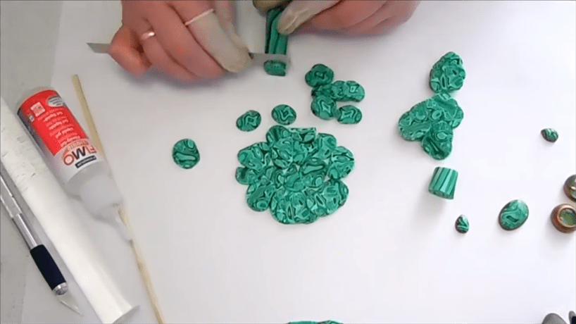 Получившиеся полоски нарезаются на примерно одинаковые квадраты, при этом не нужно следить за порядком набора цветов — узор природного малахита всегда случаен, и эту случайность как раз требуется воспроизвести.