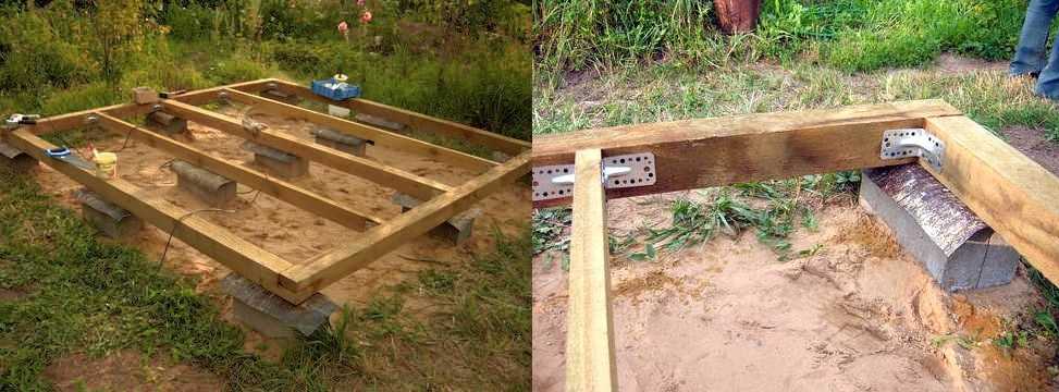 И уже на саму нижнюю раму крепим опорные брусья. Крепим их вот на такие стальные пластины в форме УГОЛКОВ. Плюс можно добавить еще металлические пластины по другим краям опорного бруса.