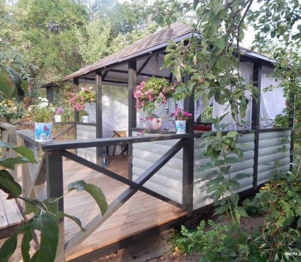 Часть стены дачной беседки может быть закрыта сплошной набивкой досок (как мы видим на фото ниже как раз секторы стенок внизу закрыты доской).