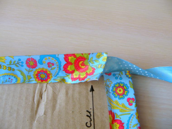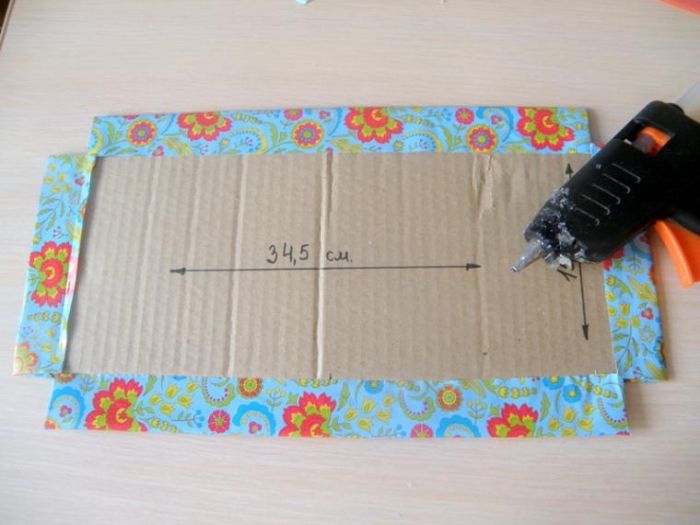 Продолжайте приклеивать ткань вокруг коробки, прижимая материал, чтобы закрепить его. Когда вы доклеите последнюю грань, подверните более длинный край ткани, чтобы его обработать.