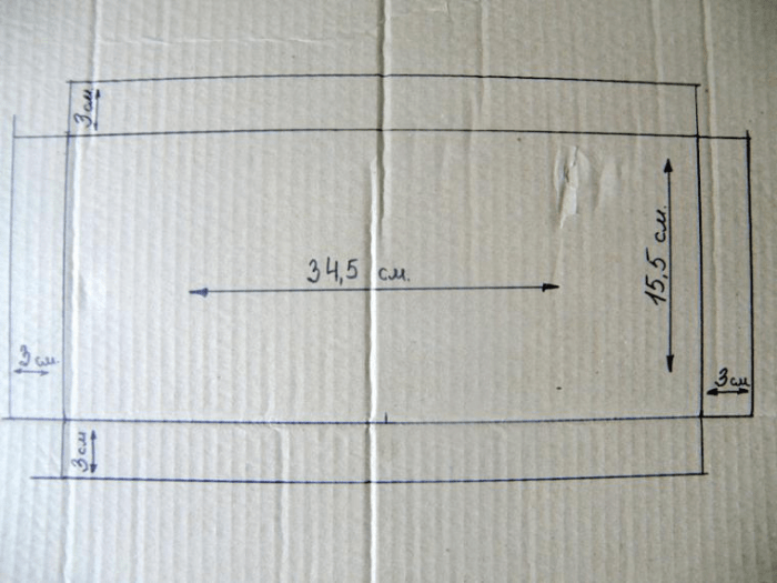 - Положите лист на ровную поверхность и сделайте чертеж, указав, где будут боковые стенки, а где торцевые. С помощью линейки прочертите ровные линии надрезов.