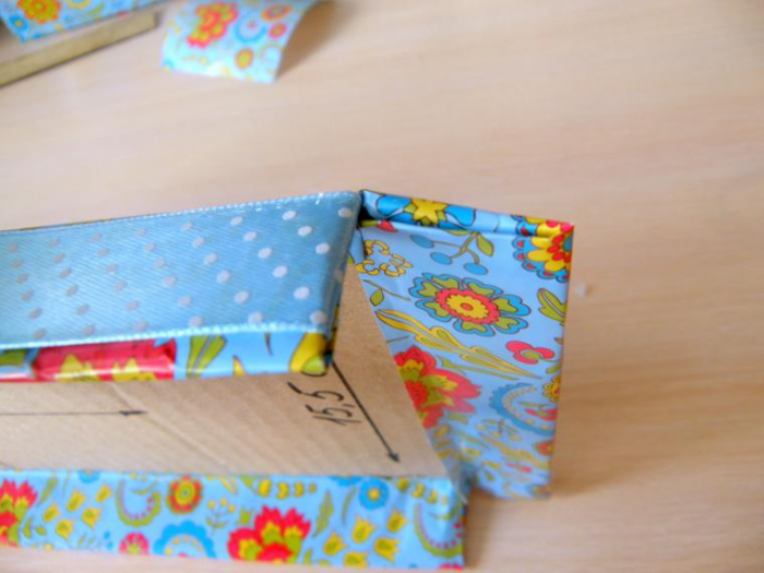 Для крышки вырежьте кусок ткани так, чтобы он покрывал ее вместе с боковыми гранями, а также с припуском, чтобы завернуть за края. Нанесите клей на поверхность крышки и приложите ткань. Подогните внутрь сначала ткань с коротких сторон крышки, а затем с длинных, надрезав ее по углам, чтобы материал лег ровно.