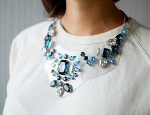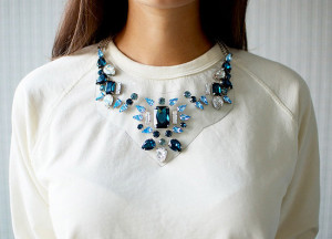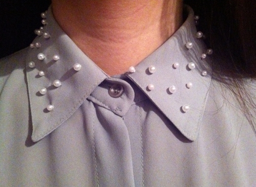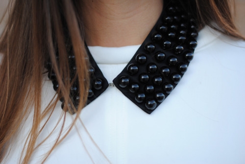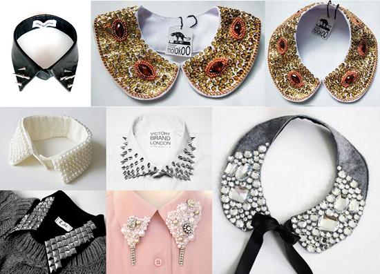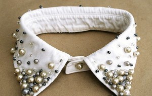 Еще один простой вариант съемного воротничка. Отрезаем от блузки или рубашки воротник и нашиваем на него все, что душе угодно: бисер, кружево, блестки, стразы. Хорошо смотрятся воротники от джинсовых рубашек. На них можно прикрепить клепки или даже шипы.