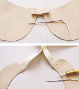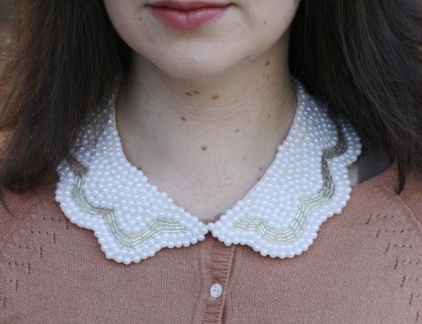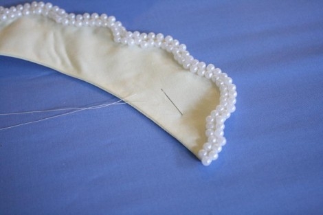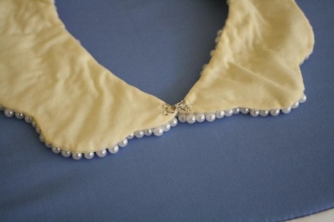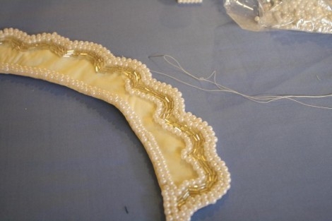 7. Настало время украшать воротник. Для начала обшейте его края жемчужными бусинами в 2 ряда.
