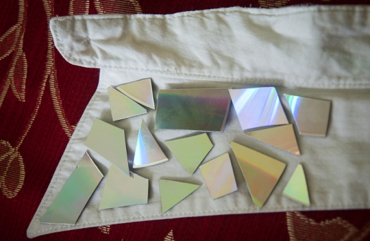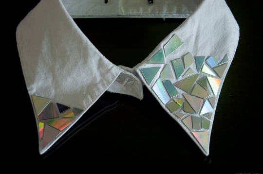 Что вам понадобится: ненужная рубашка (точнее сказать. воротник от нее), пара старых дисков (количество зависит от того, как много ткани вы хотите обклеить осколками), ножницы и клей.