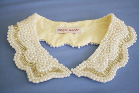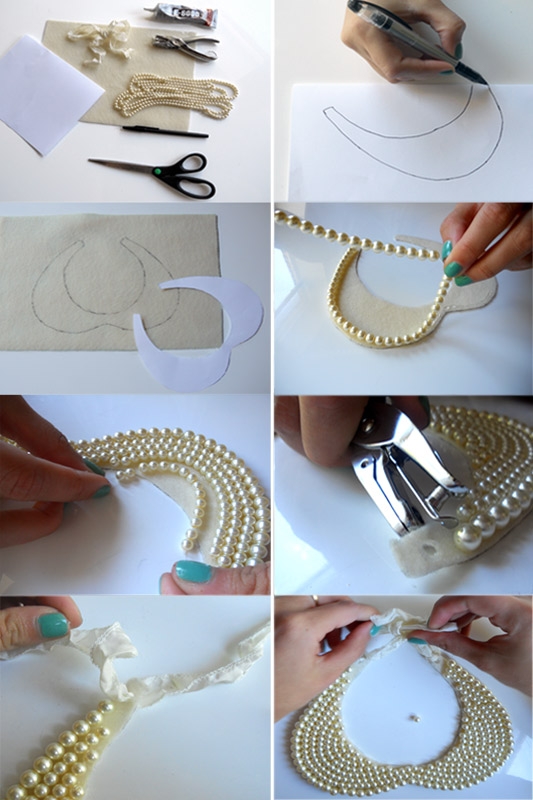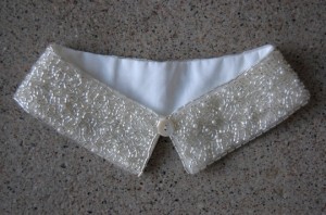 … но на самом деле все не так уж и сложно. Вам понадобится воротник, лента с биссером/пайетками/жемчугом (такие обычно продаются в швейных магазинах) и пуговичка в тон украшениям.