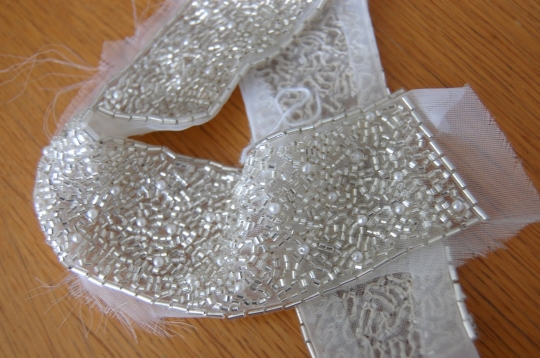 Затем — 4 ряда стекляруса. Всю остальную ткань снова обшейте жемчужными бусинами.