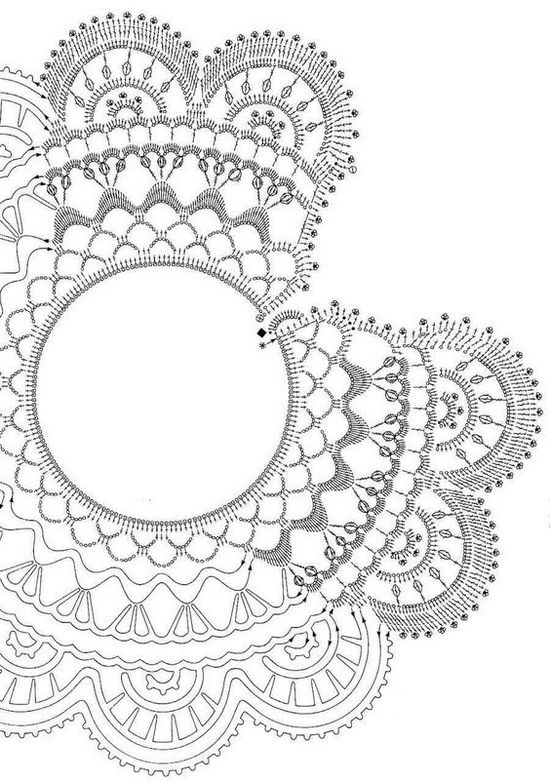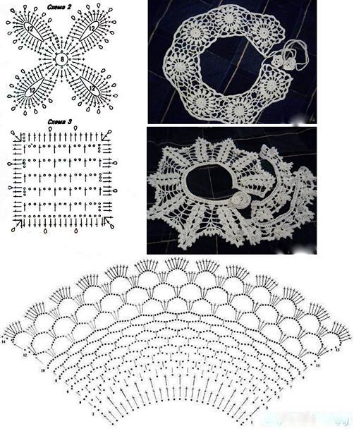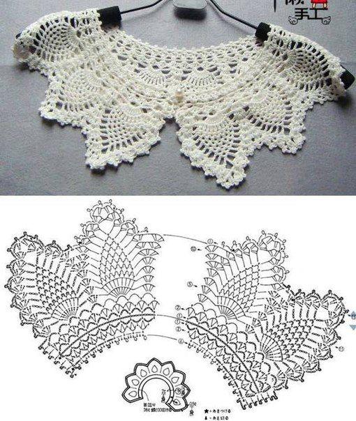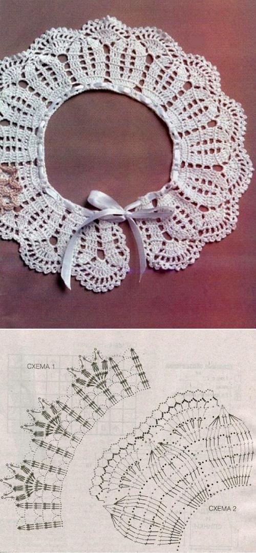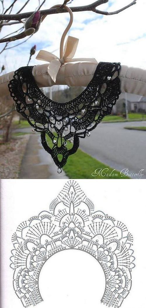 Очень эффектно смотрятся кружевные воротнички — невесомые, тонкие и изящные. Сделать такой съемный воротник своими руками можно при помощи вязального крючка и тонких ниток, к примеру, хлопковых. Для тех, кто разбирается в технике вязания крючком, предлагаю рассмотреть несколько схем. (В принципе, для вязания воротничка подойдут схемы любых кружевных мотивов.)