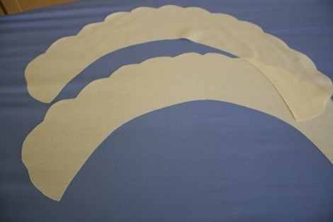 Выкраивайте воротник вдоль нити основы. Приколите бумажное лекало к ткани английскими булавками, затем обведите мелком. Сделайте вторую деталь для нижней части воротника. Еще одну часть аналогичной формы сделайте из флизелина – его используют для подкладки. Вырежьте также подкройную деталь.