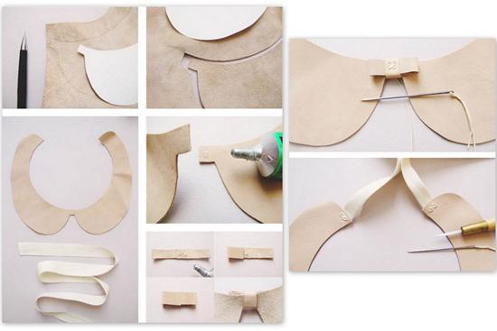 Вырежьте воротничок нужной формы из пластика, наклейте на него бусины или камешки, сложив их в узор. В качестве застежки подойдет цепочка с карабином.