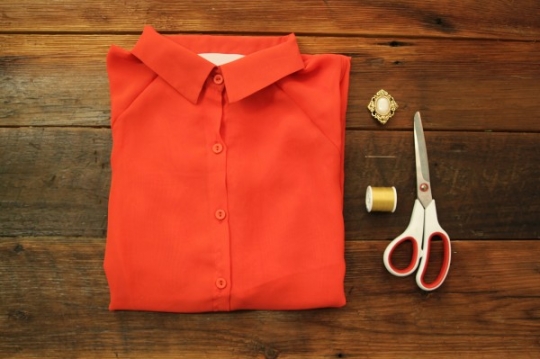 Вам понадобится однотонная рубашка, брошь, нитки с иголкой и ножницы.