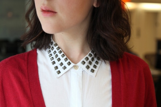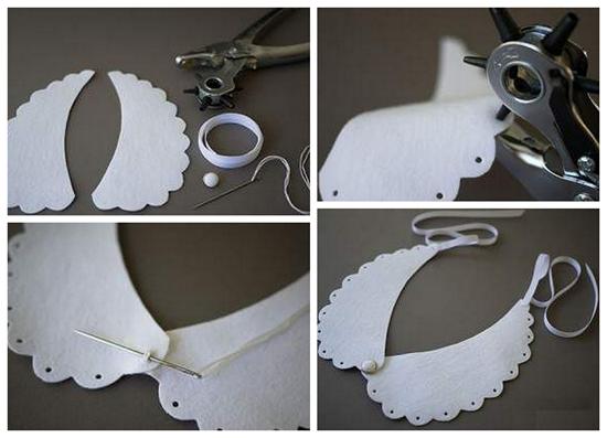 Для создания следующего воротника вам не потребуются особые знания в швейном деле. Только немного терпения и хороший глазомер. А также: рубашка, перо (или что-нибудь острое для проделывания отверстий) и декоративные винтовые заклепки.