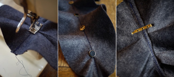 Украшаем воротник красивыми пуговицами. С обратной стороны пришиваем застежки-булавки, одну сверху, другую — снизу.