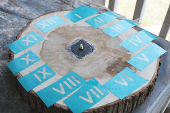 Когда краска высохла, приступим к цифрам. Так как срез дерева не слишком большой, мы решили сделать всего 4 основные цифры:3, 6, 9, 12. Для этого мы купили наклейки в виде цифр. Отклейте цифры от основы и поэкспериментируйте, где их лучше расположить. Используйте карандаш, чтобы наметить расположение цифр. Не приклеивайте цифры к дереву.