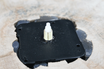 Если ваш срез заранее не обработан, то сделайте это самостоятельно при помощи шлифовальной шкурки. Затем при помощи дрели просверлите подходящее по диаметру отверстие для часового механизма.