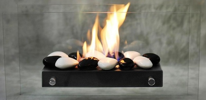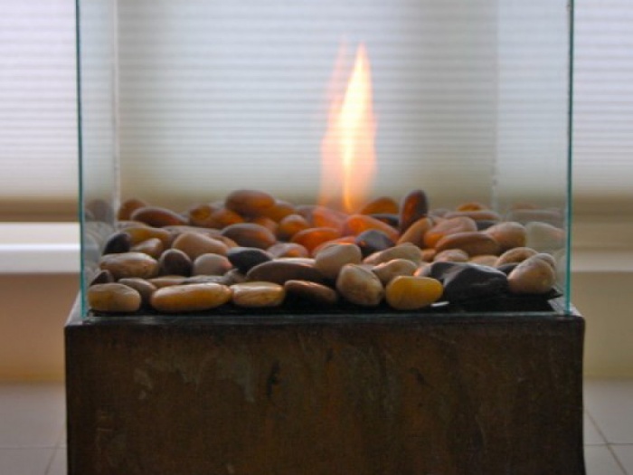 , которая выполнена из жаропрочной керамики, стали или стекла. Оформление производится декоративными камнями, этот вариант отлично подходит для создания романтической атмосферы.