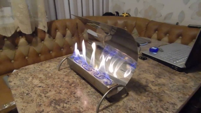 Конструкция представляет собой спиртовую горелку определенной формы. В баке находится тампон, который «продвигает» жидкость к месту сгорания. Суть работы состоит в том, что пары горючей жидкости – биоэтанола – сгорают в очаге, образуя пламя.