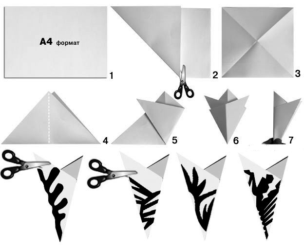 Сложите его так, чтобы получился треугольник и отрежьте лишнюю часть. Теперь, если вы развернете лист, то увидите идеальный квадрат. Из него и делают снежинку из бумаги а4.