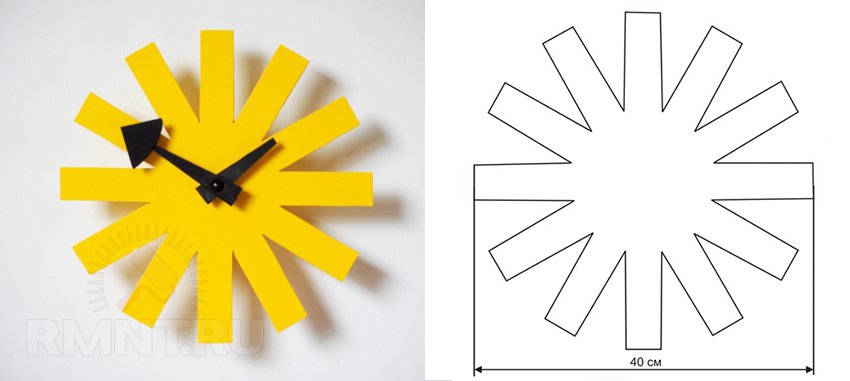 Форму циферблата перенесите на фанеру и выпилите лобзиком. Дальше нанесите на него узор, отображающий время. Здесь все зависит от Вашего вкуса.