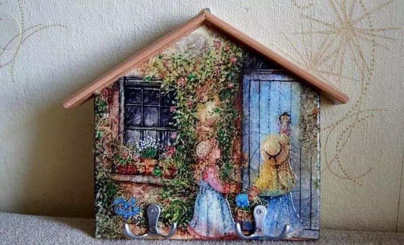 При изготовлении ключницы важно не забывать о декоре, ведь она является полноценным элементом интерьера прихожей. Деревянные изделия обычно красятся акриловыми красками или лакируются. Обширная цветовая гамма красок на акриловой основе с матовой или глянцевой поверхностью позволят вам создать интересный дизайн.