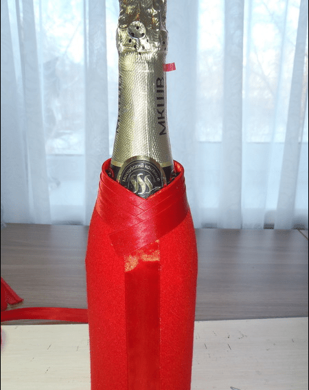 Украшаем бутылку шампанского к новому году лентами (в виде деда мороза и снегурочки)