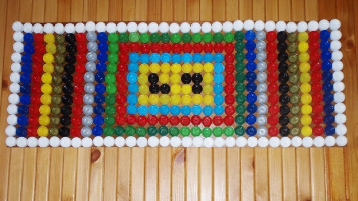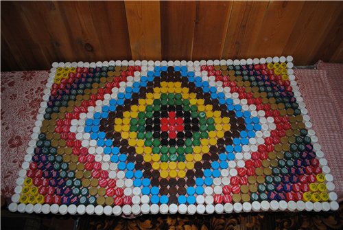 Практичным в бытовом использовании будет коврик для прихожей, сделанный своими руками. При помощи клеевого пистолета крышки от бутылок склеиваются между собой в любой форме и любого вида, для придания яркости используются цветные крышки. Он легко и просто очищается от грязи.