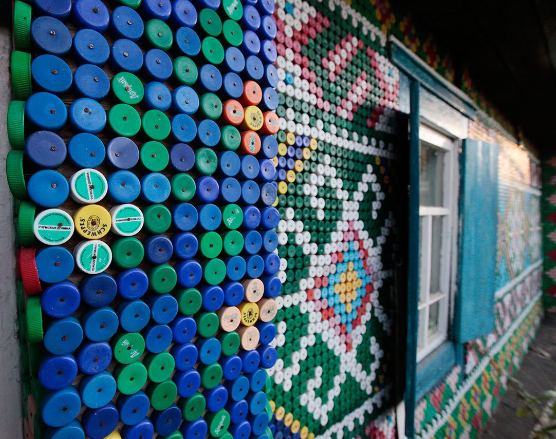 С помощью крышек для бутылок можно выкладывать различные орнаменты. Так вы разнообразите бесцветные стены.