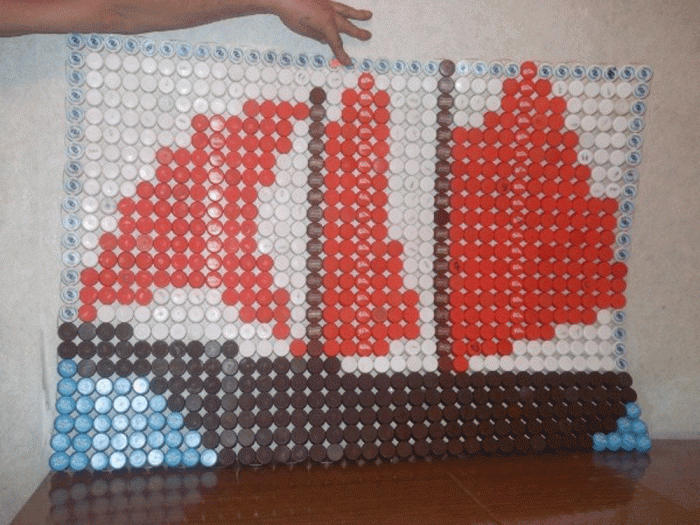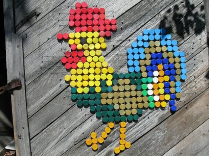 Такой вариант поделки из крышек от бутылок встречается редко. Принцип оформления довольно прост. Первоначально на листе картона создают эскиз будущей поделки, прорисовывая все разноцветные элементы. Ориентируясь на эскиз, пробки скрепляются клеем для пластика.