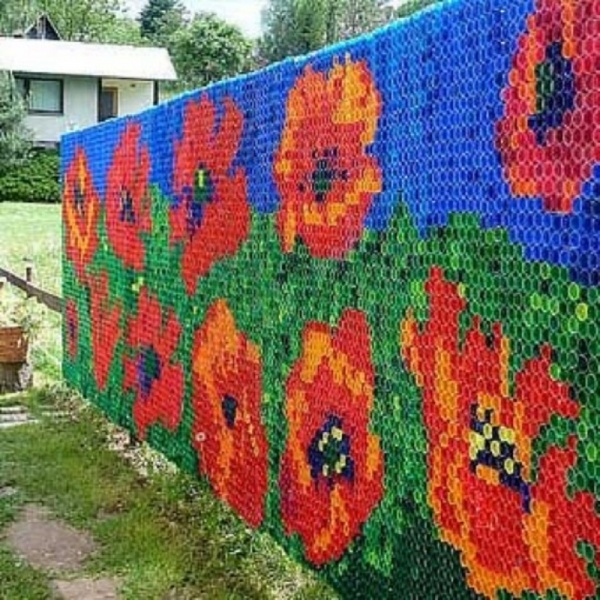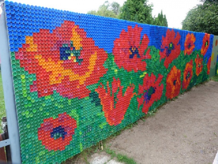 Достаточно взять обычные горшки, приклеить на них разноцветные крышки. - Ворота, ограждения и заборы. Большое количество денег можно сэкономить, сделав забор на дачном участке своими руками. В данном случае на готовый каркас конструкции выкладывают мозаику из крышек.